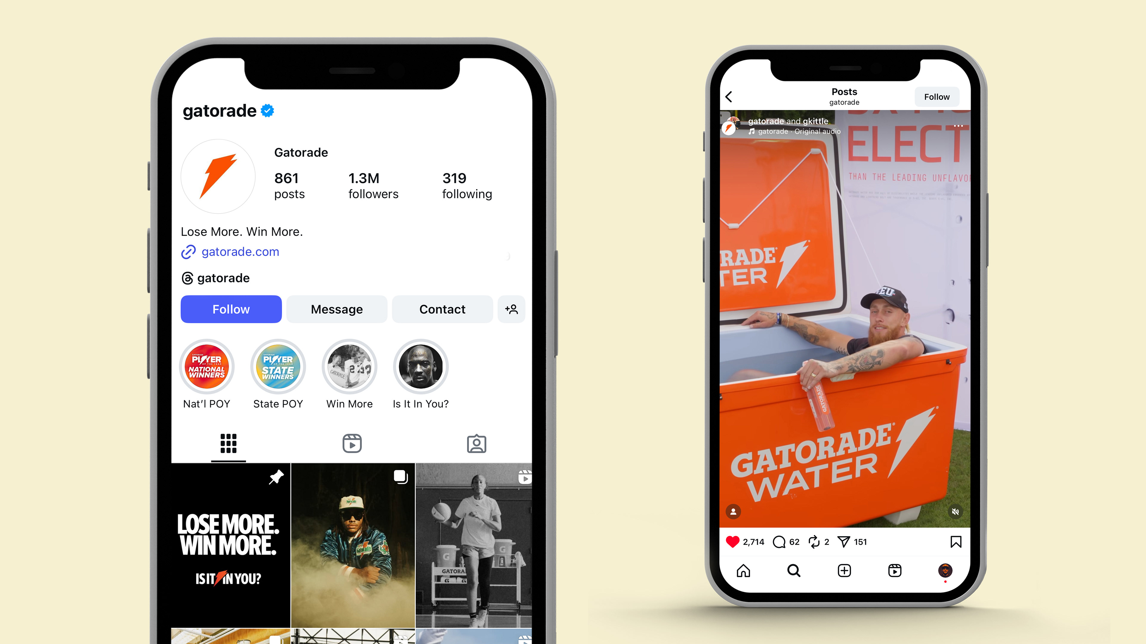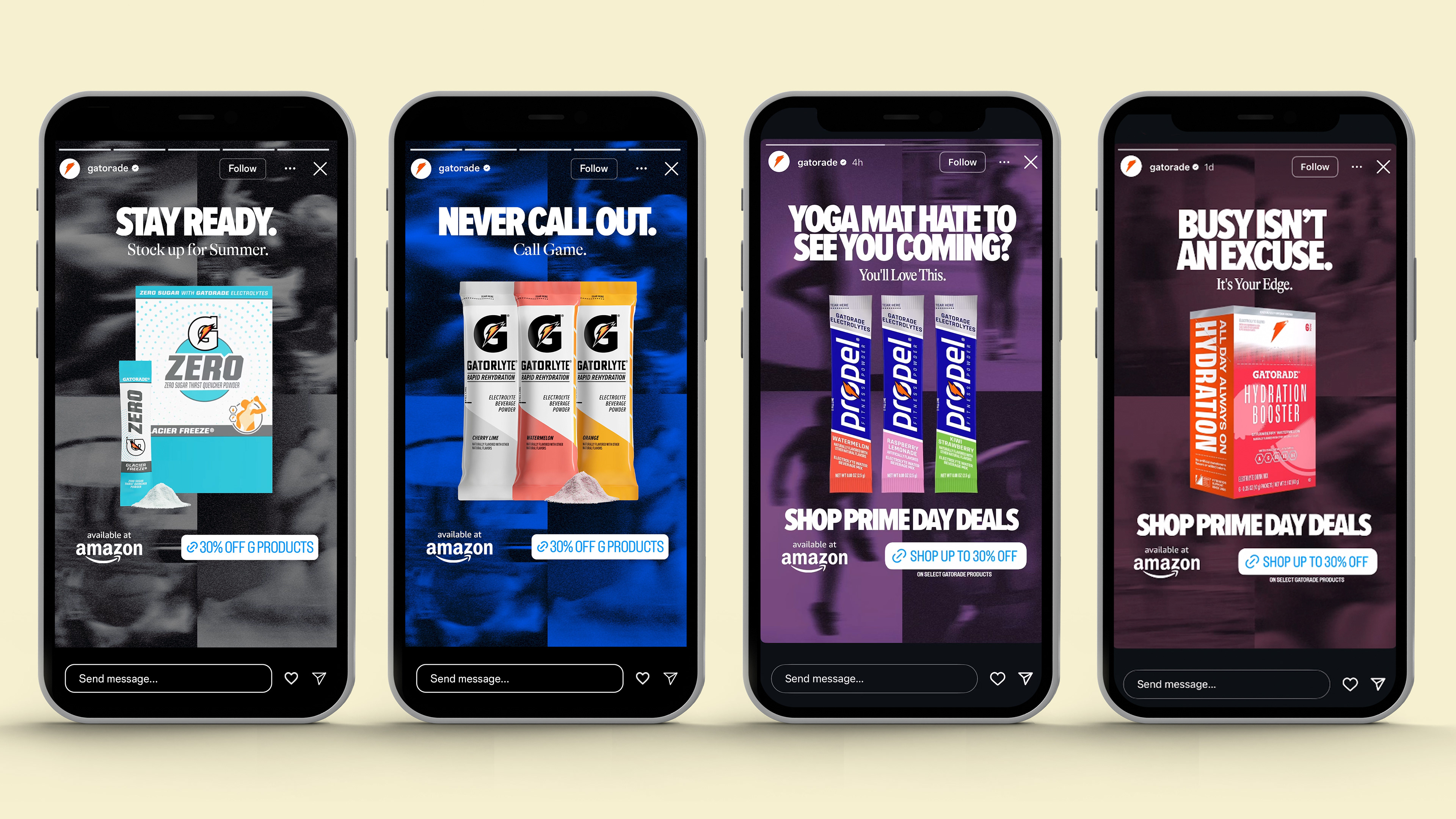 Built Story concepts and templates for Gatorade’s social presence during Prime Week—thumb-stopping frames, offer callouts, and modular assets optimized for speed and brand consistency.